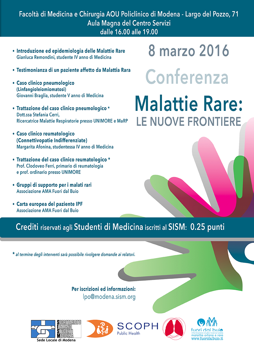 Si terrà l’8 marzo 2016, presso la Facoltà di Medicina e Chirurgia di Modena (Largo del Pozzo, 71), dalle ore 16 alle 19, la conferenza "Malattie Rare: le nuove frontiere", organizzata dagli studenti della facoltà stessa, con il supporto di AMA Fuori dal Buio (Associazione Malati Autoimmuni Orfani Rari). Nel corso della giornata si affronteranno temi fondamentali per gli studenti di medicina, iniziando dal concetto generale di malattia rara.