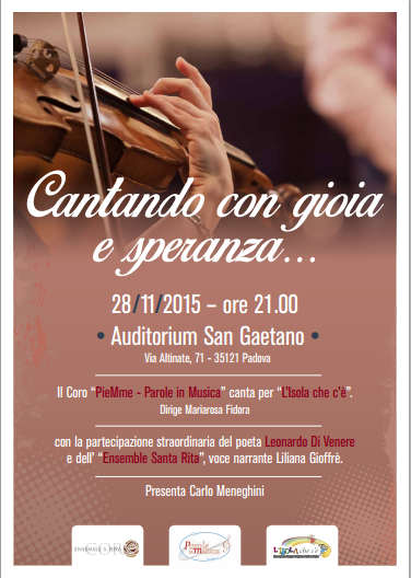 Si svolgerà sabato 28 novembre alle ore 21.00, presso l’Auditorium S. Gaetano di Padova (Via Altinate), il concerto ‘Cantando con gioia e speranza’ del coro PiemMe – Parole in musica per sostenere le attività dell’Hospice Pediatrico di Padova, unico centro di riferimento specialistico del Veneto in cui una equipe multidisciplinare offre presa in carico globale in cure palliative e terapia del dolore, a bambini affetti da gravi patologie incurabili.